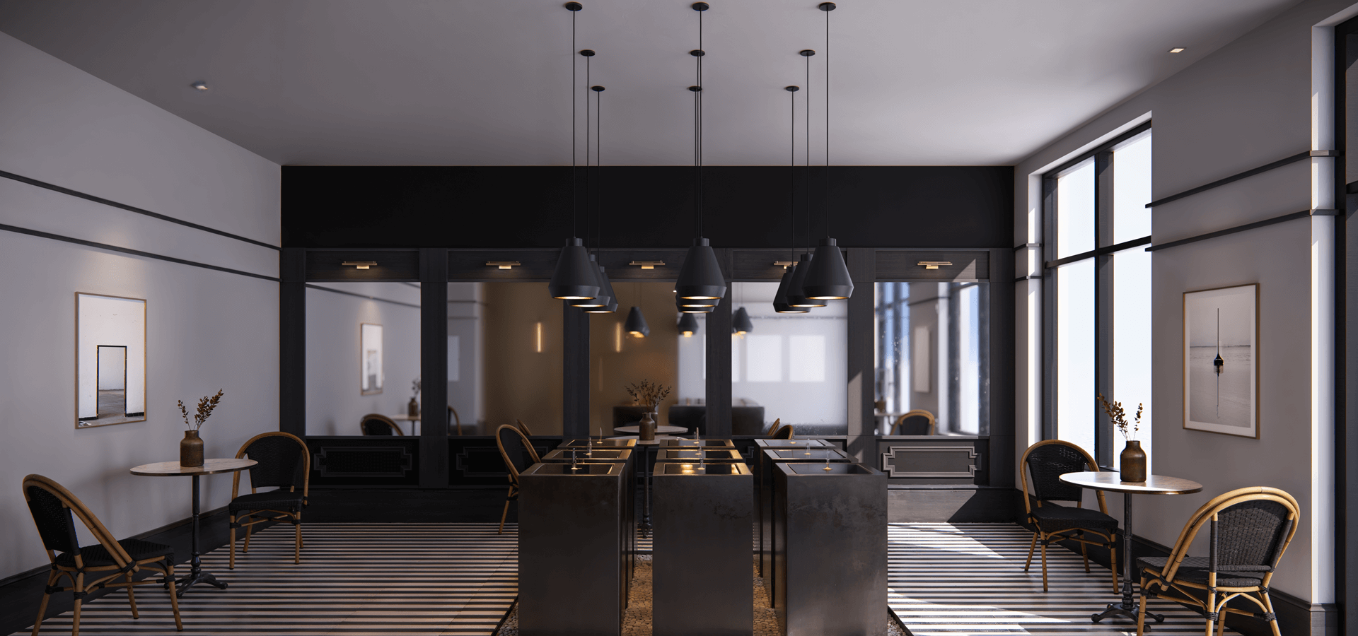 Sleek appliances, textured countertops and matte black accents strike the perfect tone of contemporary yet comfortable.